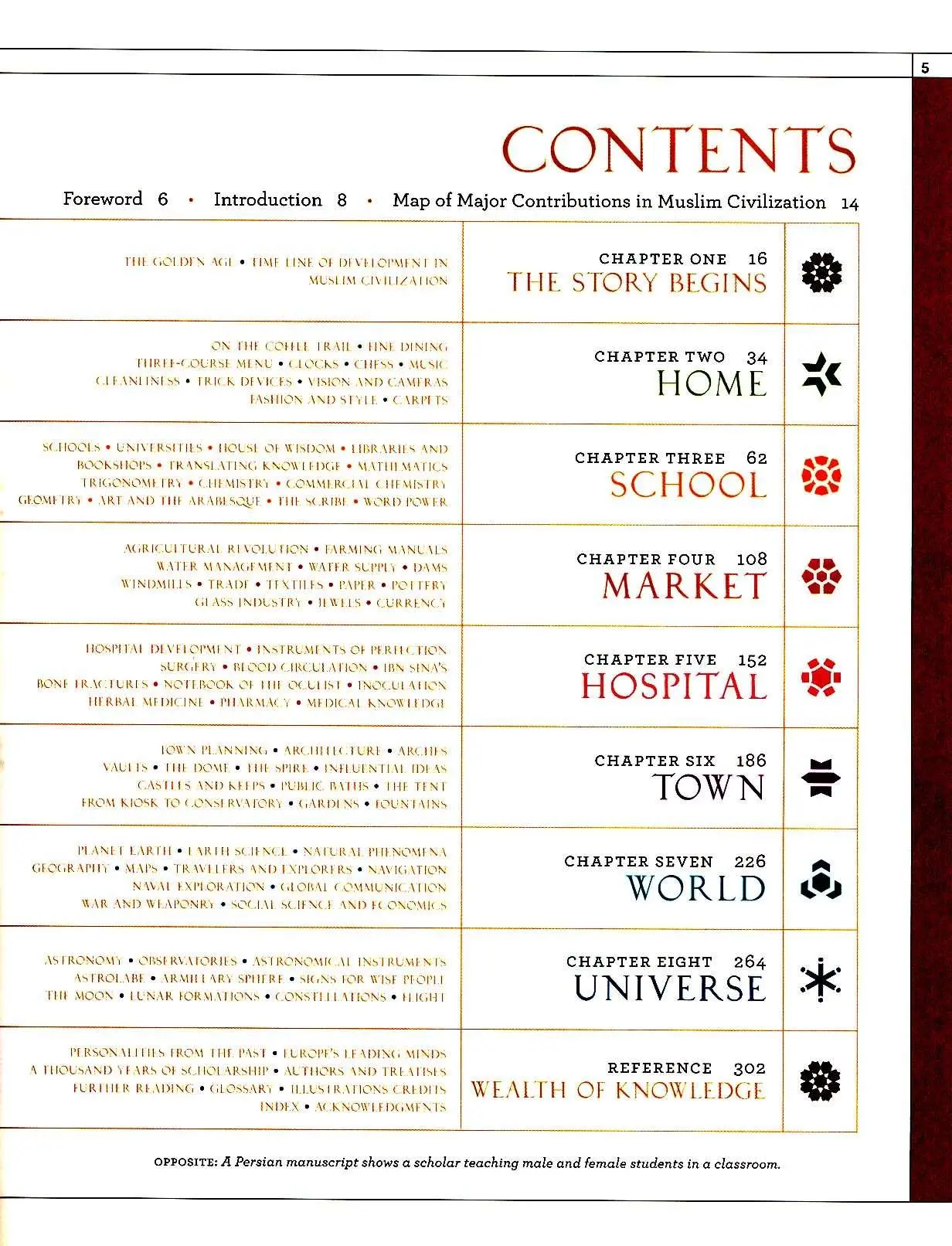 1001 Inventions provides unique insight into a significant time period in Muslim history that has been looked over by much of the world. A time where discoveries were made and inventions were created that have impacted how Western civilization and the rest of the world lives today. The book will cover seven aspects of life relatable to everyone, including home, school, hospital, market, town, world and universe.