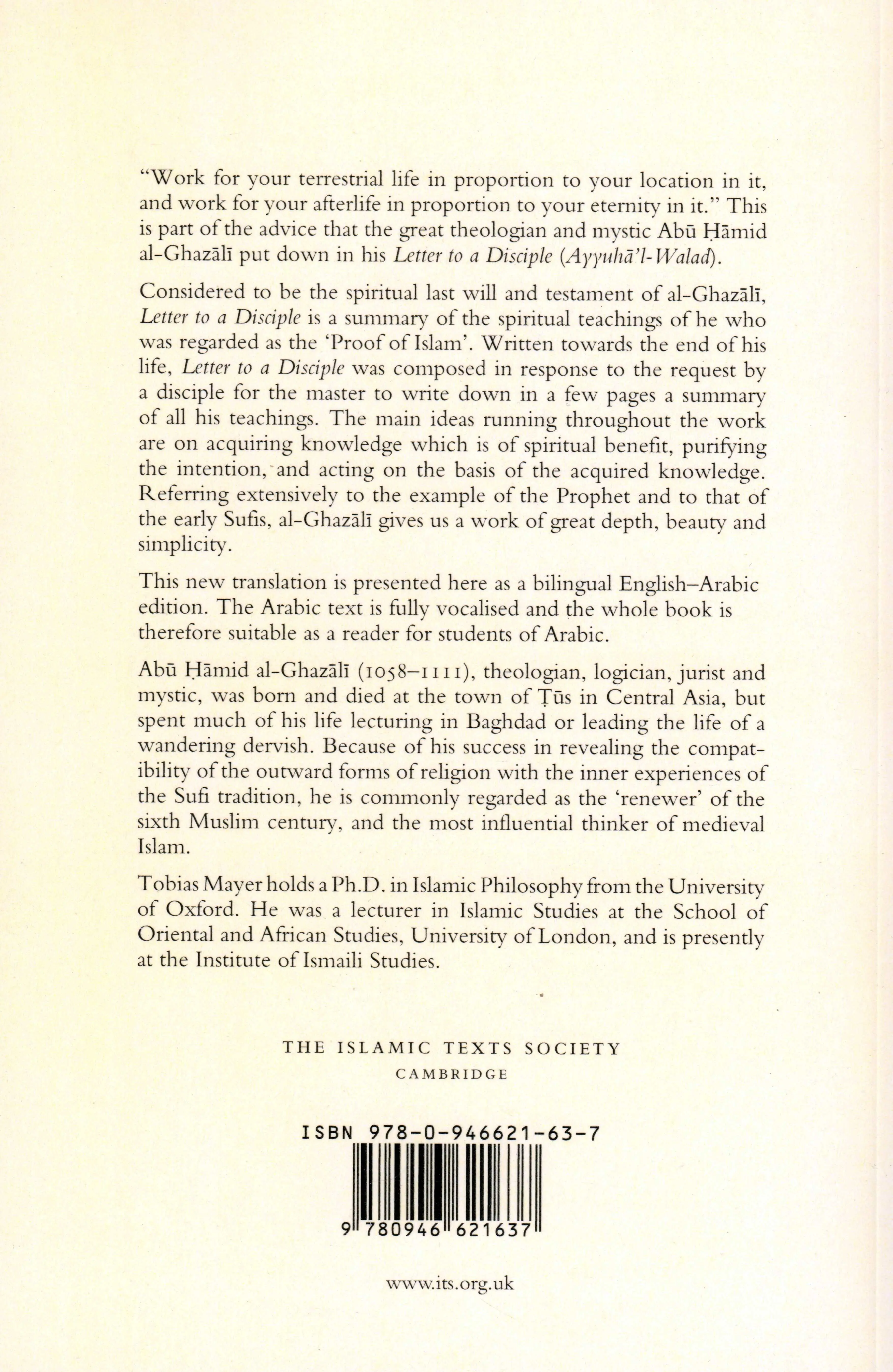 Praise belongs to God, the Lord of the worlds, and the ‘outcome belongs to the God-conscious,’ and blessings and peace be upon His Prophet Muhammad and all his family. Know that one of the advanced students devoted himself to the service of the master, the Imam, the Ornament of Religion and Proof of Islam, Abu Hamid ibn Muhammad al-Ghazali(may God sanctify his spirit) and occupied himself with the acquisition and study of knowledge under him, until he mastered the details of the sciences and filled out the good qualities of the soul. Then one day he considered his situation, and it occurred to him, ‘I have studied various kinds of science, and I have spent my life learning and mastering them. I now ought to find out which kind will be of use to me on the morrow, to keep me company in my grave, and those which are not of use to me, so that I may give them up. As God’s Messenger (God bless him and give him peace) said, ‘O God, I take refuge in Thee from knowledge which is not useful!’ This thought persisted to the point that he wrote to the honourable master, the Proof of Islam, Muhammad al-Ghazali (may God the Exalted be merciful to him), seeking a ruling, asking questions, and requesting both advice and a prayer, ‘even though the works of the master such as The Revival [ of the Religious Sciences (Ihya’ ulum al-din)] and others contain the answers to my questions, what I want is for the master to write down what I need in a few pages to be with me for the rest of my life, and I will act in accordance with what is in them during my term, if God the Exalted wills.’ So the master wrote him this message in reply, and God knows best.