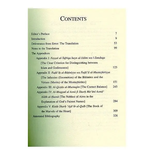 This new edition contains five important works of Ghazali in addition to "The Deliverance from Error," which makes the volume a significant contribution to the works of Al-Ghazali currently available. Included as appendices are Kitab Sharh Aja'ib al-Qalb (The Explanation of the Wonders of the Heart), Al-Qistas al-Mustaqim (The Correct Balance), Al-Maqsad al Asna fi Sharh Ma'ani Asma Allah al-Husna (The Noblest Aims in the Explanation of God's Fairest Names), Faysal al-Tafriqa bayn al-Islam wa l-Zandaqa (The Clear Criterion for Distinguishing between Islam and Godlessness), and Fada'ih al-Batiniyya wa Fada'il al-Mustazhiriyya (The Infamies of the Batinites and Virtues of the Mustazhieites).