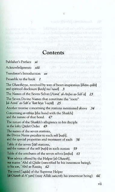 A collection of the work and explanations of Shaikh 'Abd al-Qadir al-Jilani (may Allah be well pleased with him), that includes definition and attributes of the seven selves [nafs], an explanation of the names of the seven stations [maqamat], the creed ['aqida] of the Supreme Helper (may Allah be well pleased with him), the meaning of the names of the Qadiriyya order, the remarkable virtues of al-Jilani the Qutb, the names of our master, 'Abd al-Qadir, litanies [awrad] for the taming of hearts and for emergency situations; how to offer the greeting of peace [salam] to the men of the unseen [Ghaib] and much much more.