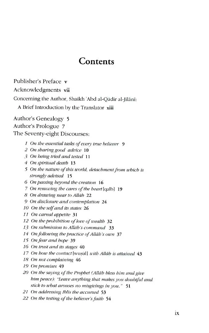 This is probably the best known of Shaikh 'Abd al-Qadir's works as there have been previous translations of it in both English and German. These are 78 discourses [majalis] that cover a wide range of topics of great importance to the spiritual traveler and are listed in their entirety below: