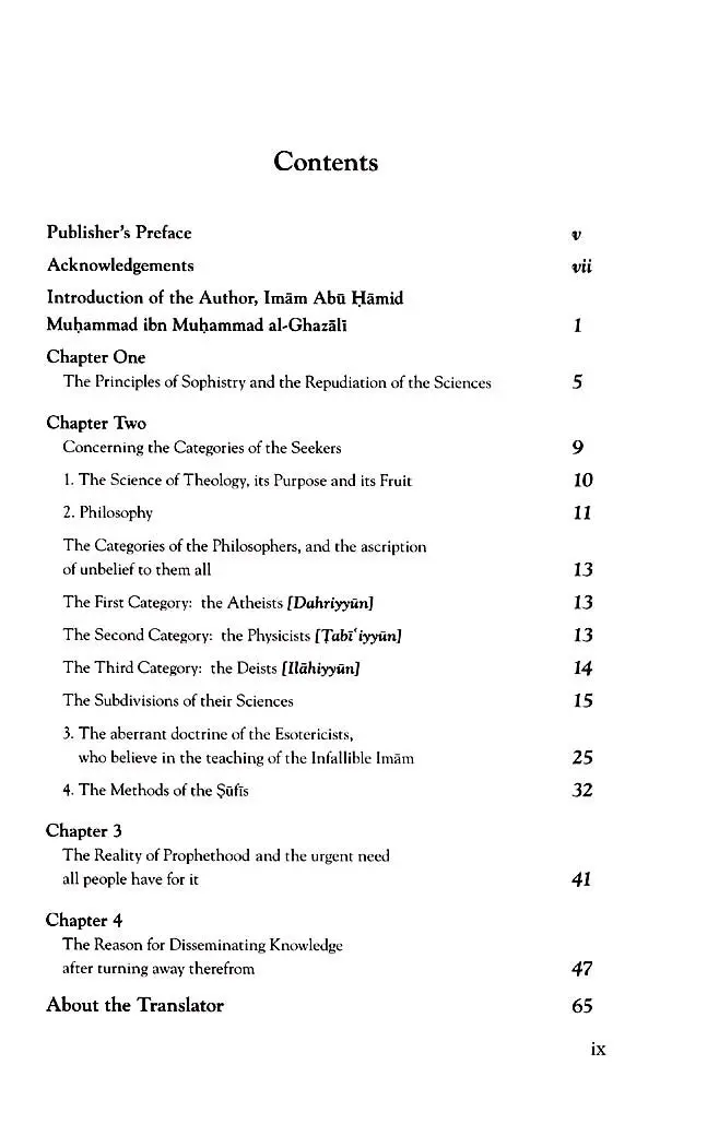 Imam al-Ghazali takes time to repudiate the methods and logic of the philosophers and the esotericists (batiniyya) and the principles of sophistry. Lastly, he provides a section on the Reality of Prophethood and the urgent need all people have for it.